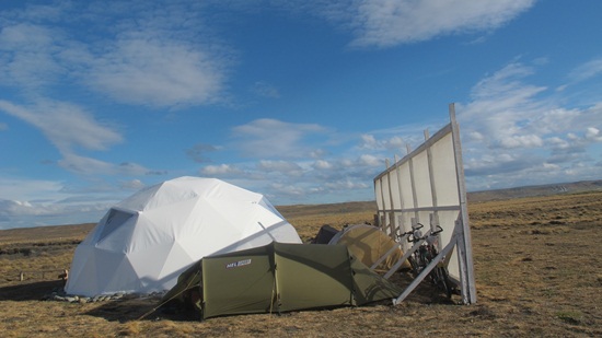 For the night, we camp nearby and use this structure to shield us against the ferocious wind.