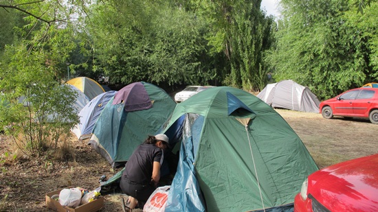 Argentinian camping is pretty fun! Tents are pitched wherever there is space. Tauru gets some things from the tent, which is next to another similar tent. Doite is like Coleman in South America and there are a lot of them.