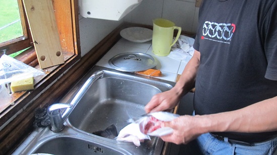 He gets busy and removes the scales like a professional.
