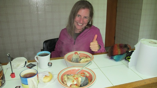 We meet Eduardo, who's on a six-month contract to oversee the project. He takes care of us for the night and lets us use his shower (it's been 10 days since our last!) and then cooks us this delicious "tricha" for dinner. Thanks!! Yum!!