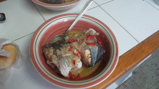 Not with Eduardo! Christi gives a thumb-up for a massive bowl of fish.