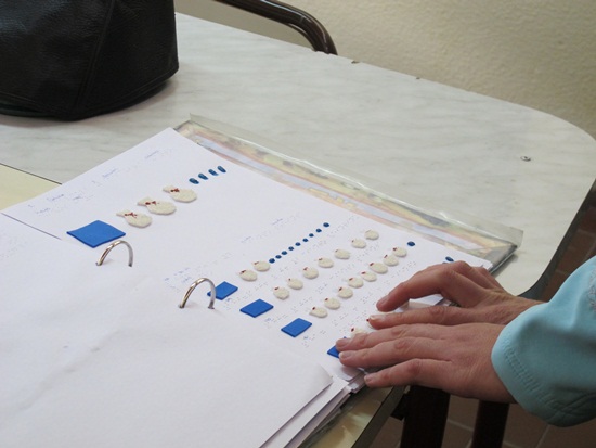 Next we visit the primary-school-aged classroom, but they are away on break. Christi takes the opportunity to learn how the children learn concepts like counting without the same visual cues sighted children use. The squares, bags and dots are raised so that students can feel the images.